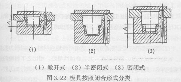 ②密闭式模具如图3.22 (2)所示。模具的加料室为型腔上部的延续部分,无挤压面。压机所施加的压力全部作用在制品上。模压料的溢出量非常少。制品的密实性好,机械强度较高,且飞边在垂直方向,易于去除。这种模具适合成型形状复杂、薄壁、长流程的制品,也适用于流动性小、单位压力大,密度大的模压料。其缺点是:加料量必须准确控制;模具凸模与加料室边壁摩擦,边壁容易损伤,在顶出时带有有损伤痕迹的加料室壁又容易将制品表面损伤。