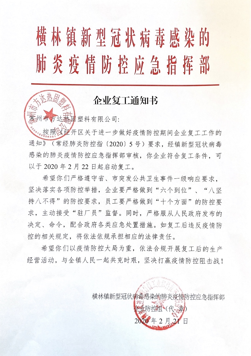 尊敬的各位新老客户以及广大的朋友:我公司于2020年2月23日正式开工,各项工作...